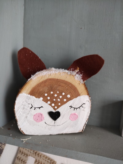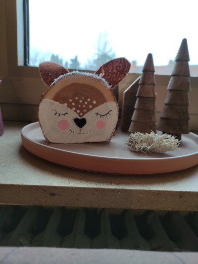 Für alle, die gerne zuhause weihnachtlich basteln möchten gibt es hier das kleine Rehkitz, das Ihr schleifen, bemalen und bekleben könnt.