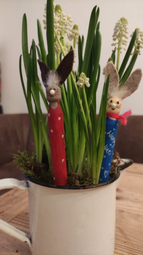 Vier kleine Hasen-Wichtel aus hölzernen Retro-Wäscheklammern, die Ihr mit Euren Farben gestalten könnt.