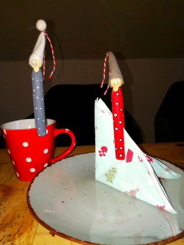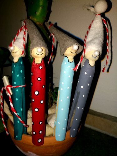 Vier kleine Wichtel aus hölzernen Retro-Wäscheklammern, die Ihr mit Euren Farben gestalten könnt.